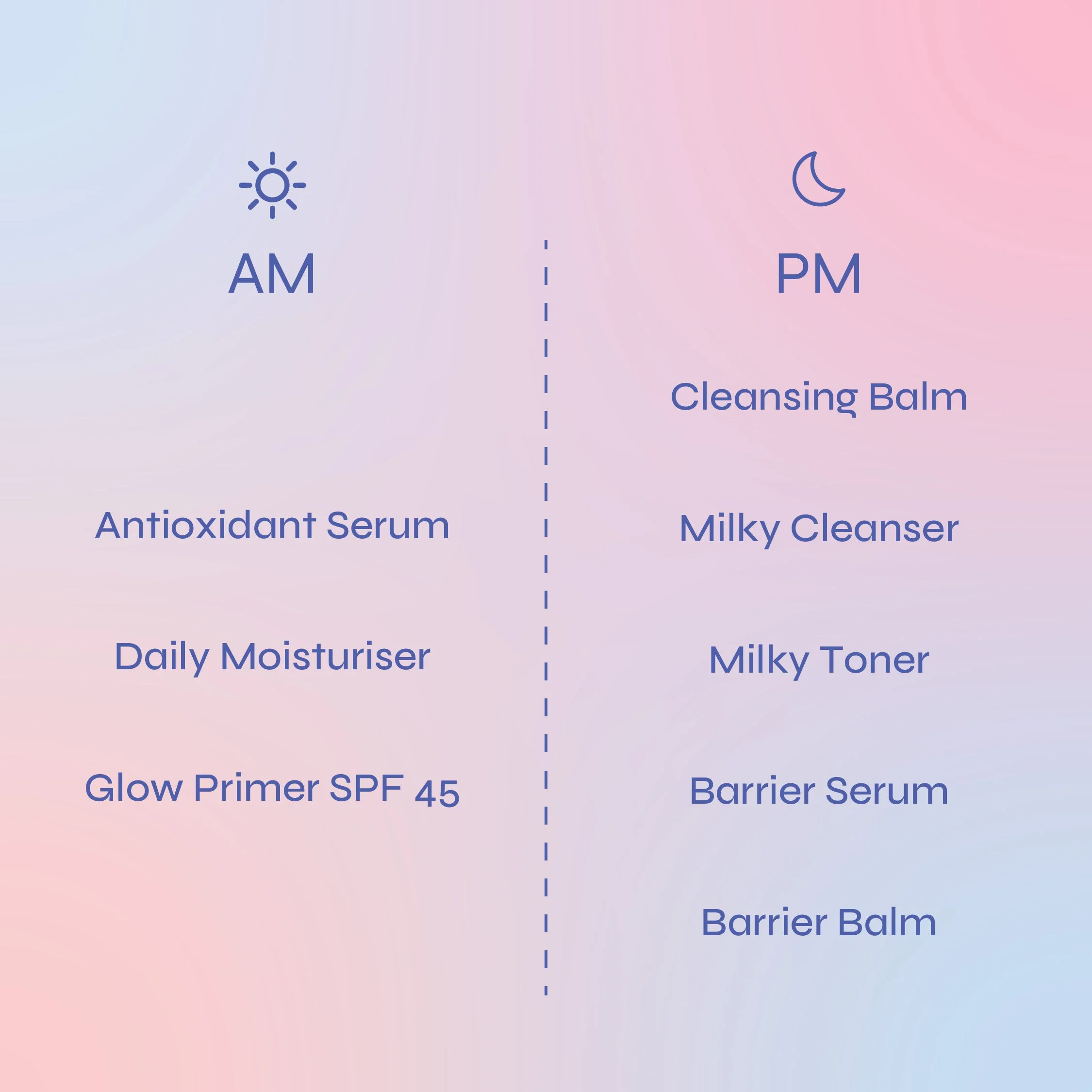Wind down with the ultimate nighttime reset. The 3-in-1 Cleansing Balm effortlessly melts away makeup, followed by the Milky Cleanser for a double cleanse that leaves skin feeling refreshed. The Milky Toner strengthens and repairs, while the Barrier Serum boosts collagen and smooths fine lines. Finally, the Barrier Balm locks in moisture, so you wake up with calm, nourished skin.