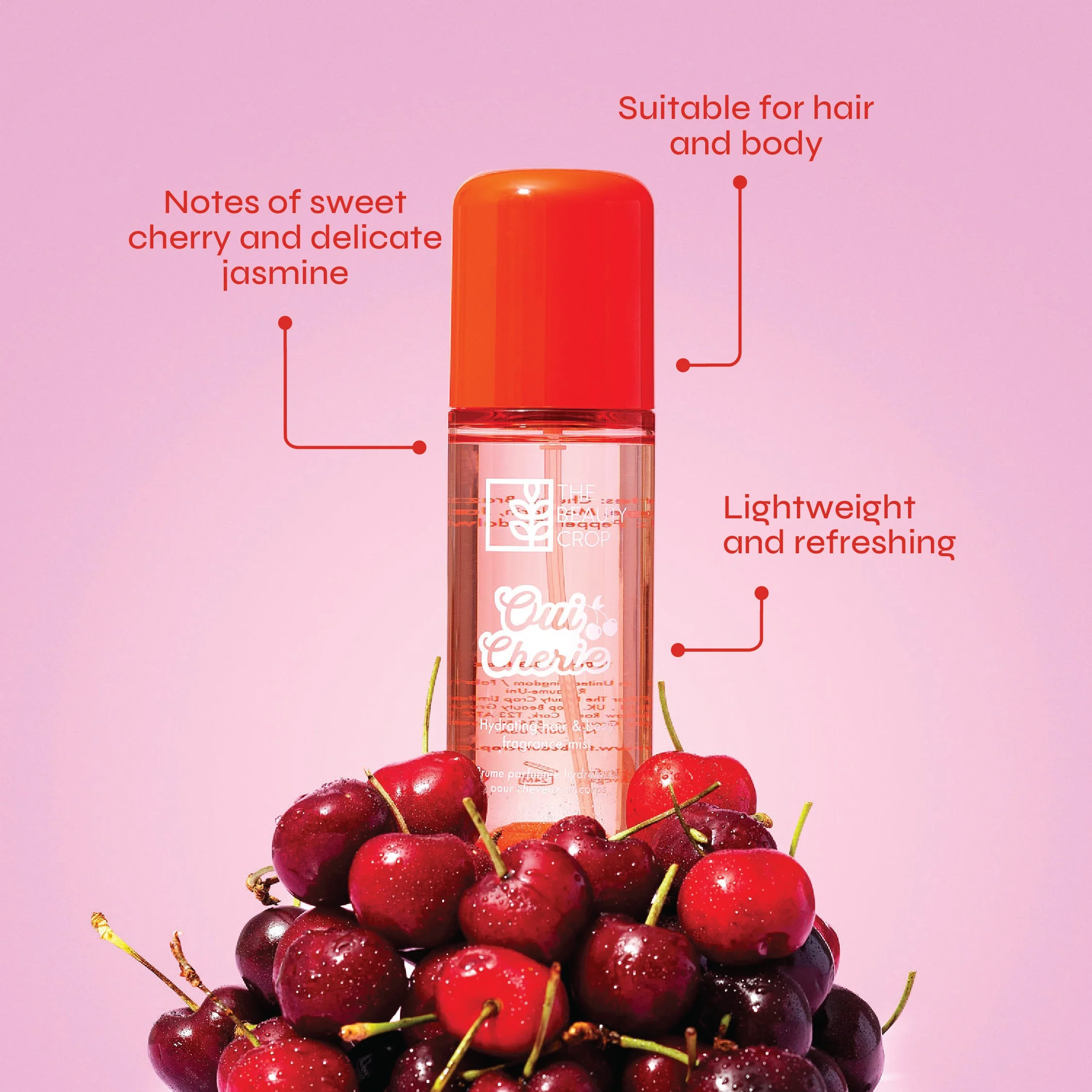 Escape into a cherry-scented daydream with our Oui Cherie Hydrating Hair & Body Fragrance Mist.This lightweight, refreshing mist blends juicy cherry notes with a soft touch of jasmine, capturing the perfect balance between flirtatious and elegant. It opens with a bright burst of Cherry, Brazilian Orange and Mandarin, leading into a delicate floral heart of Jasmine, Pink Pepper and Lemon Leaf. Finally, it settles into a warm, cosy base of White Musk, Amber and Sandalwood that lingers softly on your skin throughout the day.Suitable for both hair and body, this feel-good fragrance fits seamlessly into your everyday routine and is bound to become your signature scent for feeling fresh, flirty and confident. Spritz it solo or layer with the Oui Cherie Hydrating Body Wash and Body Cream for the ultimate cherry-scented moment.Available in both a full size for daily use and a travel-friendly mini to maintain your routine whilst on the go.