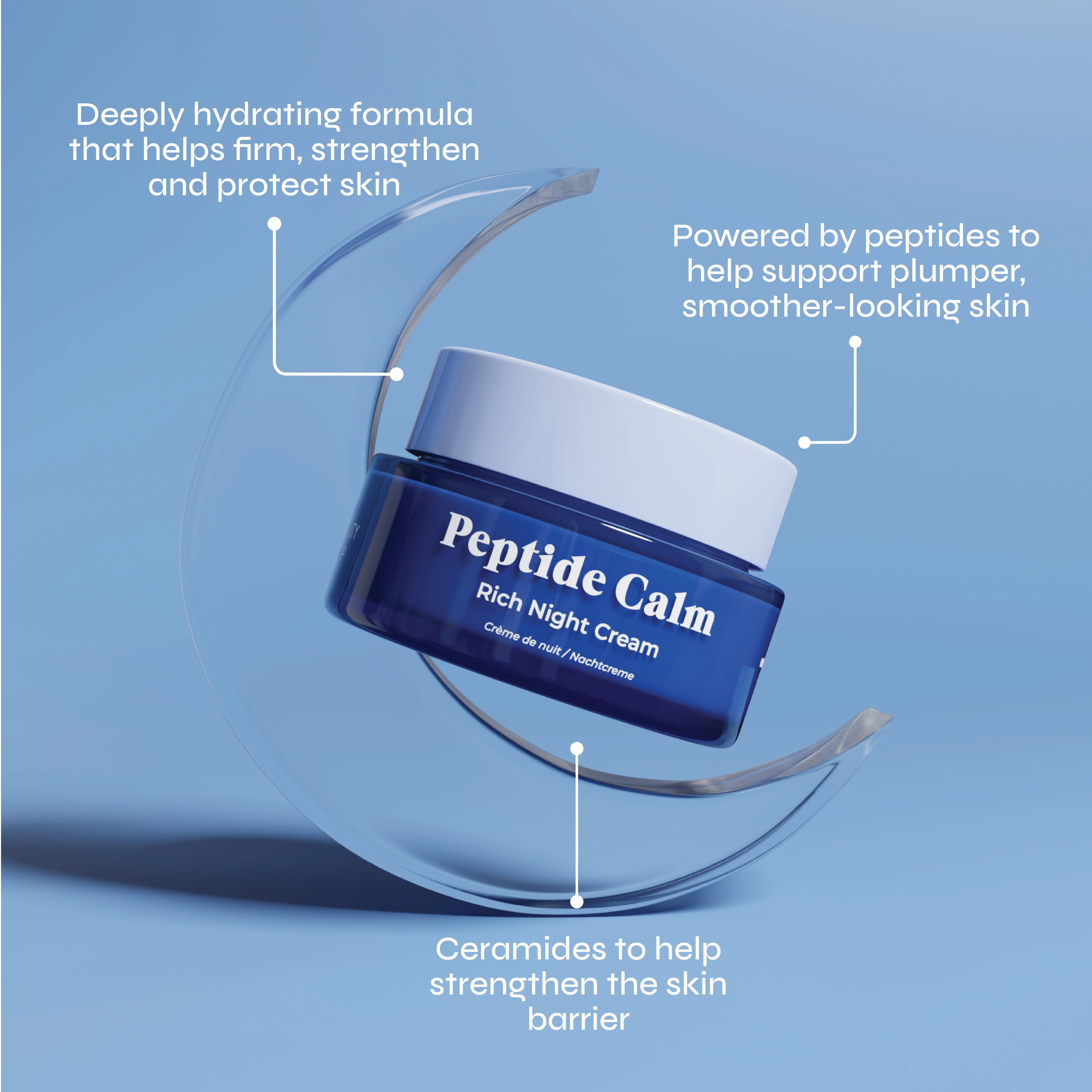 Indulge your skin overnight with our Peptide Calm Rich Night Cream - a deeply hydrating face cream designed to help firm, strengthen and protect while you sleep.